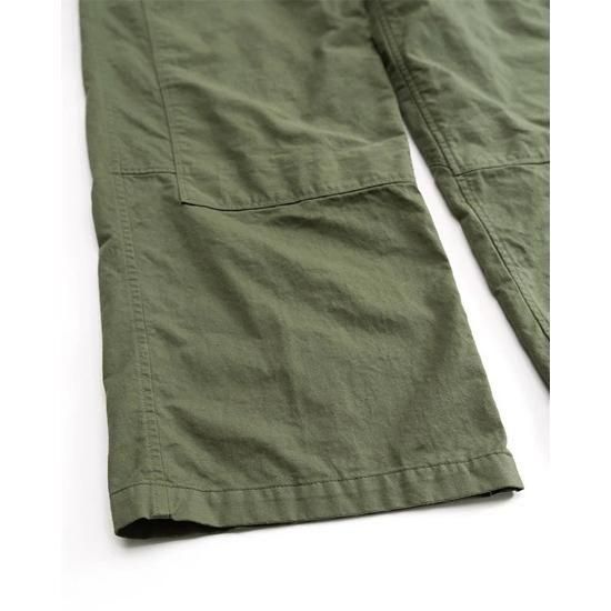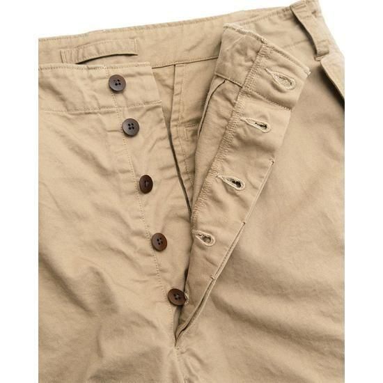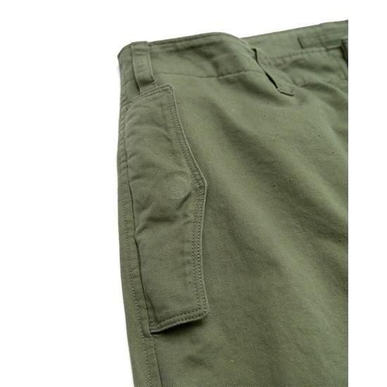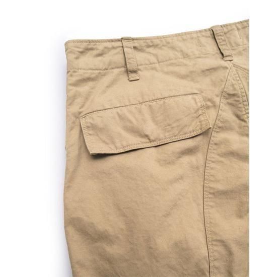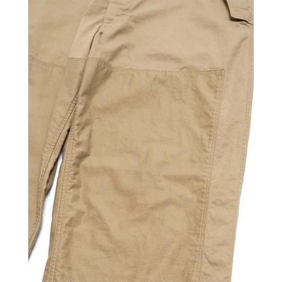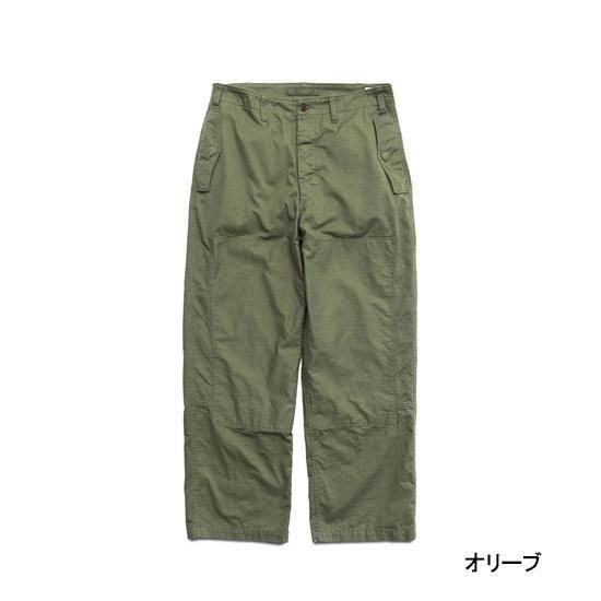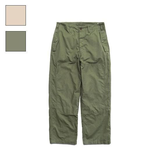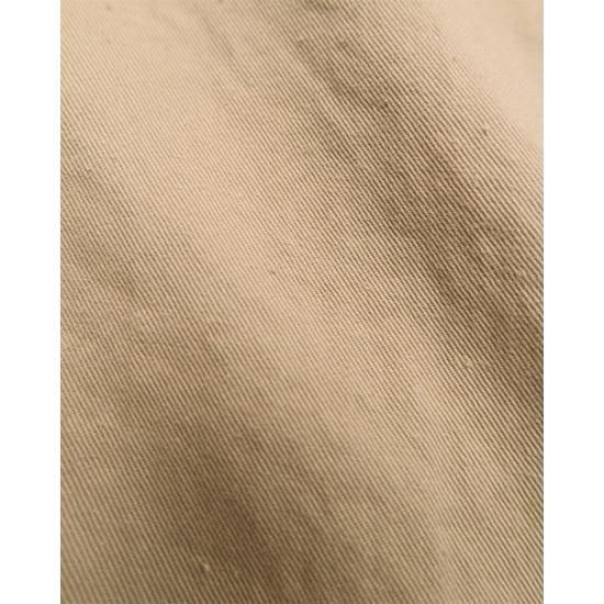 1940年代のフライトパンツをベースに、ディテールを削ぎ落として再構築。ネップ感の強いチノ生地を採用し、無骨でヴィンテージらしい表情に仕上げています。膝やヒップの当て布にはあえて生地の裏面を使用し、素材の奥行きを表現。さらに洗い加工でアタリを強調し、着古したような自然なこなれ感をプラスしました。