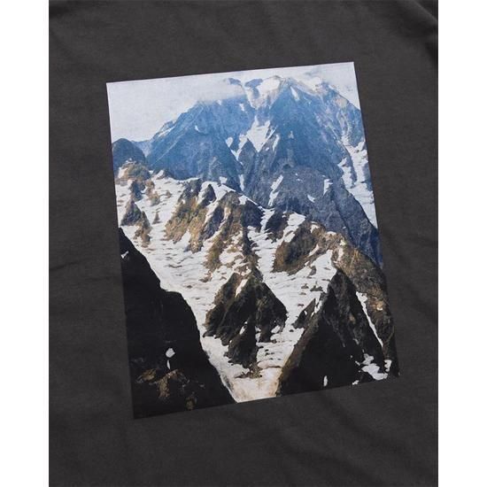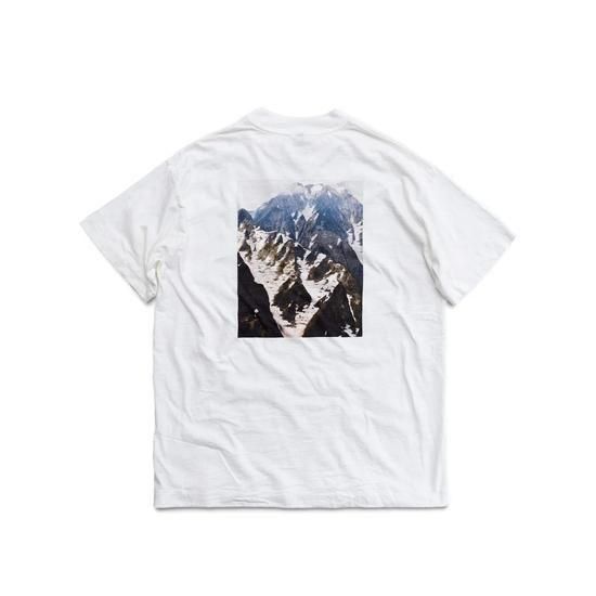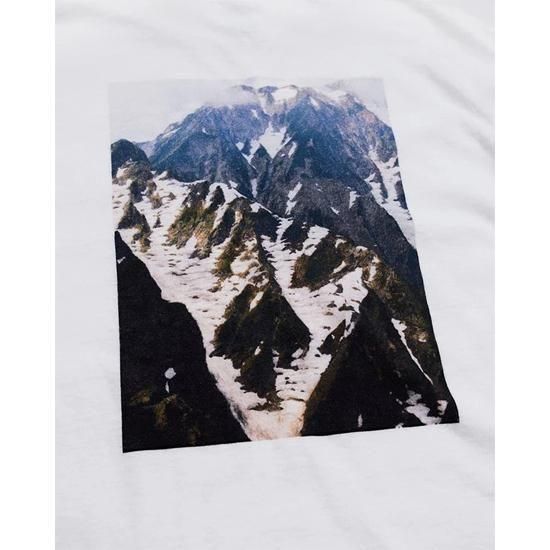 夏でも雪が残る白馬の山景を大胆に背面へプリントしたTシャツ。 ホワイトボディはロングウォッシュ、ブラックボディはピグメントダイで仕上げ、それぞれ異なるヴィンテージ感を演出しています。首周りは幅広リブに本縫いバインダー仕上げ、裾と袖口はシングルステッチ仕様。ギリシャコットンの柔らかなスラブ生地が、独特の風合いと優しい肌触りを生み出し、着るほどに味わいが深まる一枚です。