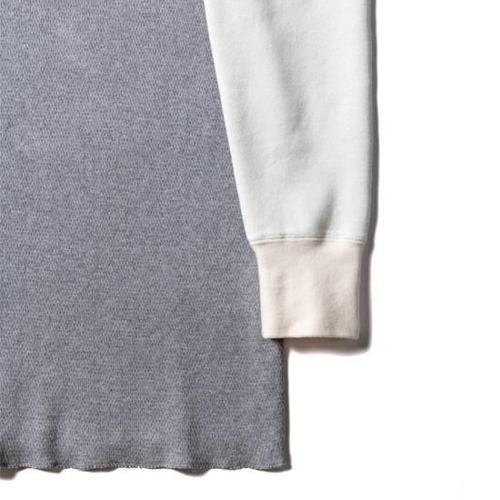 伸縮性の大きいハニカムサーマル生地(特に横側)に、キックバックの強いスパンフライスを組み合わせ、タフで型崩れしにくく長らく愛用できるでしょう。