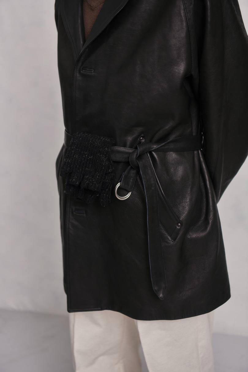 美しいアールを持つ襟からラペルにかけて滑らかに繋がるライン、ウエストのナローベルトなど
