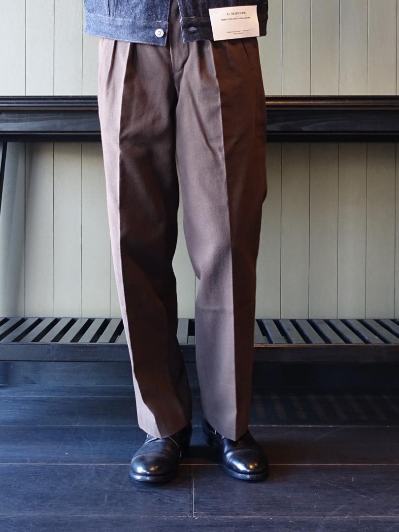 ベルトループを省いたウエストバンドに職人技が光るモミ玉ポケットにD型カンヌキ、深めの股上とダブルプリーツをとったモダンなストレートラインのバランスは現代においてユニークな存在感を放ちます。