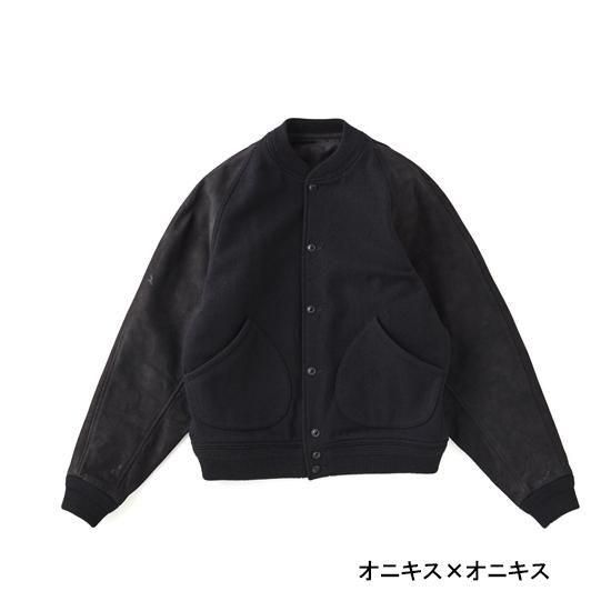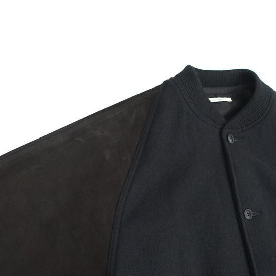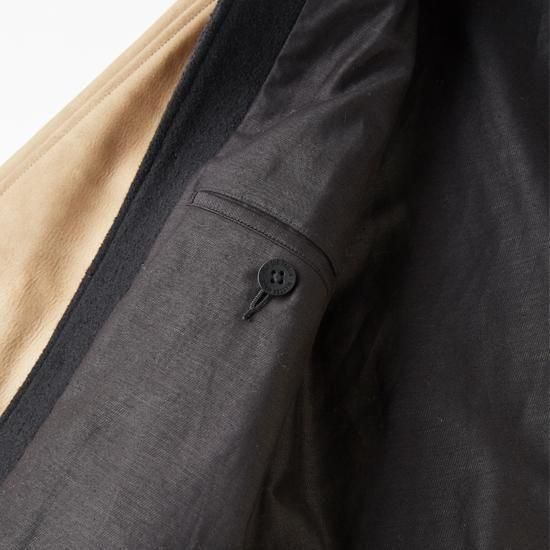 ユニークなラインを見せるラグラン切り替え、2種のウールをブレンドさせて編み立てたブークレーニットパーツ、3枚のパーツにより構成される立体的なスリーブはシュリンク作業を施したカウスキンを用いて組み立てられ、その後一点一点、手作業により味だしされます。